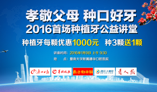 为响应广州市天河文明办“微笑广州·大型口腔健康公益”活动,穗华口腔医院将举办主题为“孝敬父母,种口好牙”的2016年首场种植牙讲座。