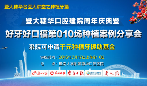 2016年7月17日上午9:00,穗华口腔医院建院周年庆典暨好牙好口福第010场种植案例分享会将邀请穗华口腔医院资深种植科专家冯智强主任现场为缺牙老人讲解种植牙知识,解析种植牙手术案例以及种植牙手术视频全程细节,并为缺牙老人解疑答惑。此外,现场还将有种植牙患者分享心得,讲述缺牙前后的感受、生活状态及心理的变化,并现场分享种植牙效果。