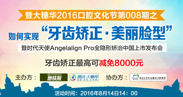 针对“如何实现牙齿矫正塑造美丽脸型”这个话题,羊城地铁报、大粤网将携手穗华口腔医院于8月14日14:00举办2016口腔文化节第008期之《如何实现“牙齿矫正·美丽脸型”?》讲座暨时代天使Angelalign Pro全隐形矫治中国上市发布会。届时,口腔行业内牙齿矫正名医专家将为广大正畸患者揭开牙齿矫正的神秘面纱,为正畸患者设计矫牙方案,让正畸患者实现美丽梦想,塑造美丽脸型,打造高颜值。另外,还可现场零距离见证牙齿矫正患者分享自己矫牙前后感受、矫牙之后的效果。
