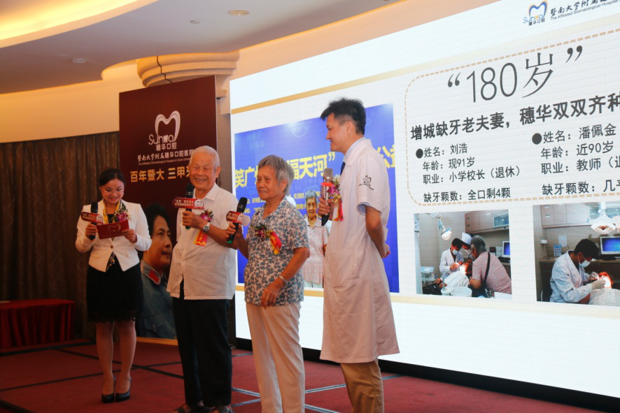 会上,一对老夫妻加起来年龄超过180岁的老人分享重获新牙、重享美食的经历。刘浩爷爷今年91岁,年轻时因牙痛被当地小门诊庸医误伤牙齿,不得不过早使用活动假牙,假牙换得多,也被牙痛折磨几十年,生活质量大受影响。而老伴潘奶奶的牙齿状况更为严重,只剩上牙4颗。对于两位90岁的老人来说,吃上大鱼大肉已成为一种奢望。在穗华口腔医院冯智强博士的帮助下,夫妻俩双双种上了新牙,当晚就吃上可口的饭菜,从此又能够喝早茶、啃凤爪。营养充足自然精力充沛,老俩口每早晨练,让年轻人都惊叹不已。