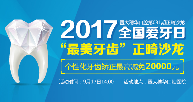 9月17日,穗华口腔医院将举办正畸学院第031期2017全国爱牙日“美牙齿”正畸沙龙,帮助牙列不齐的市民们矫正牙齿,展现“美牙齿”,提升形象,拥有更大的健康优势!