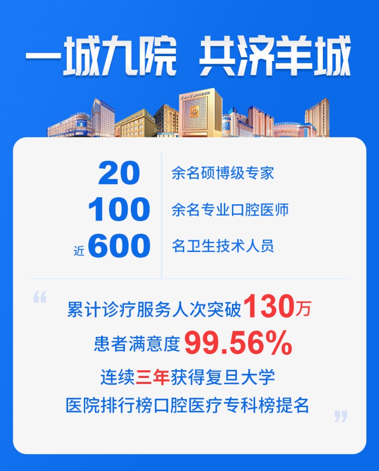 厚德行医,彰显卓越!7年来,穗华口腔医院,始终坚持“一切以顾客满意为中心”的经营理念,始终践行“服务一次、呵护一生”的六心服务理念,不断提高医疗技术水平和医疗质量管理能力,办群众放心、政府安心的口腔医院。如今牙椅总数量已经超过230张,诊疗总人次也突破130万,医疗卫生技术人员近600名,患者满意度99.56%,至今发展成为广东省具有影响力的口腔专科医院,连续三年获得复旦大学医院排行榜口腔医疗专科榜提名。